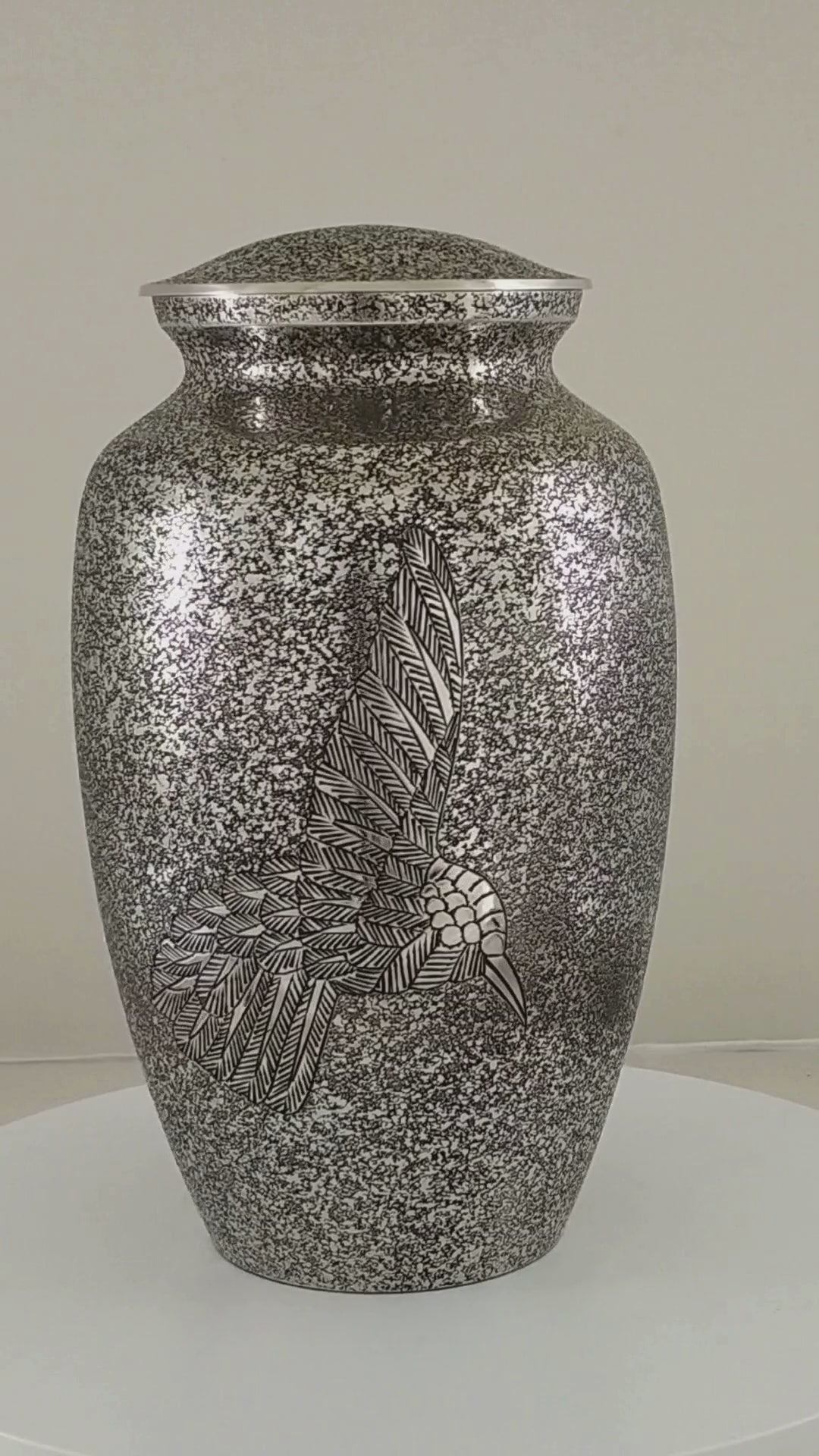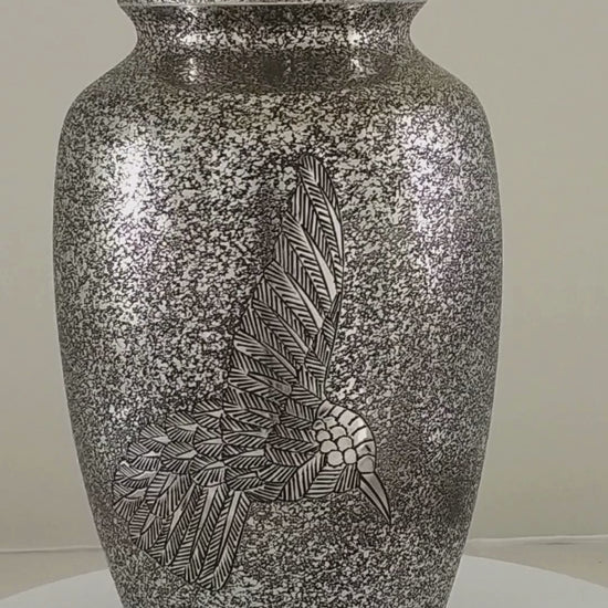 A stunning solid brass urn with a textured nickel finish. The Hummingbird Nickel Urn has a fine hammered pattern on the body and lid. The silver nickel finish over this hammered pattern gives a textured look with a black paint revealling the pattern. A hummingbird is etched onto the front of the urn. This cremation urn is made from solid brass, requires no maintenance and is very well made and is heavy in weight.