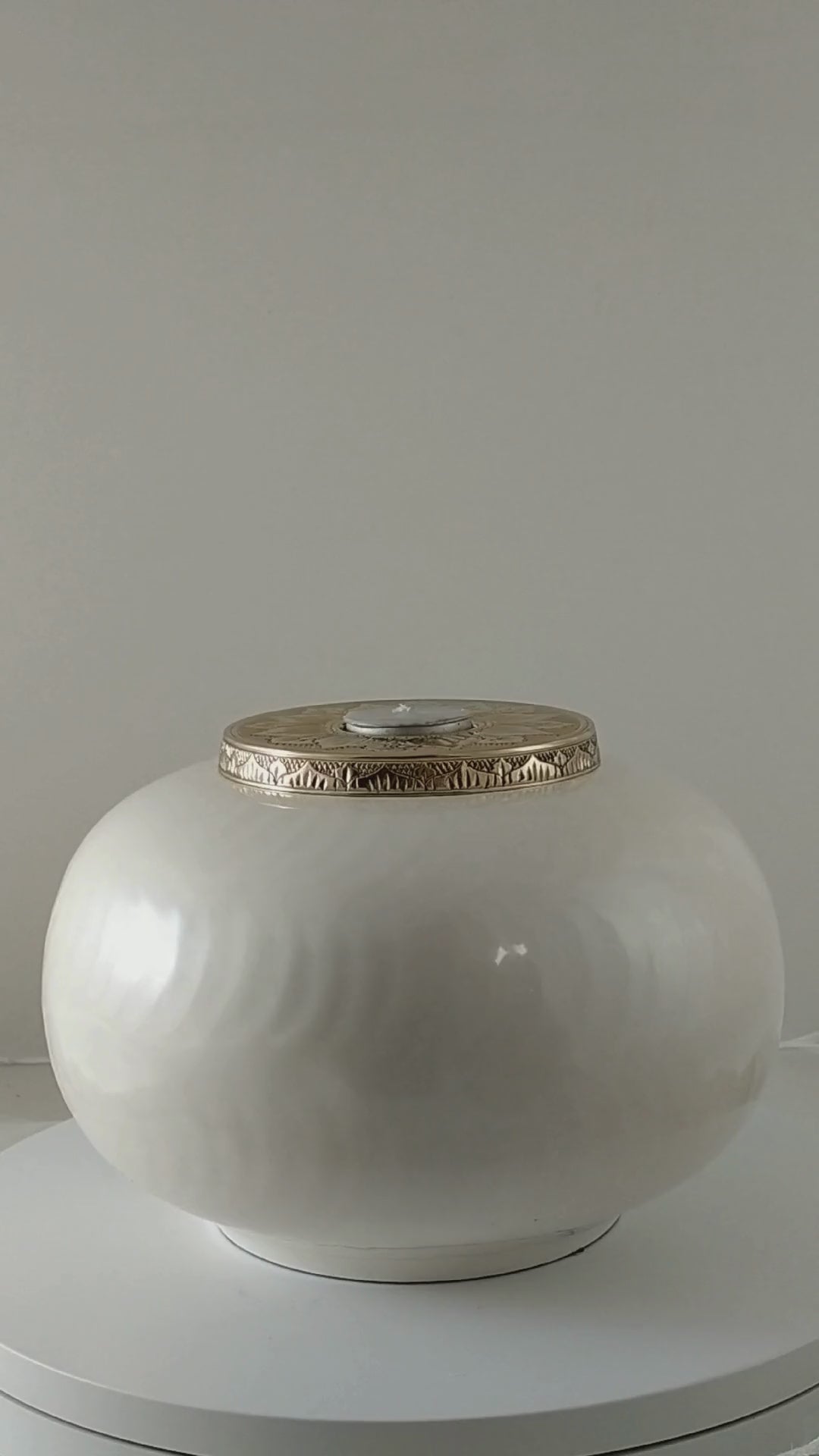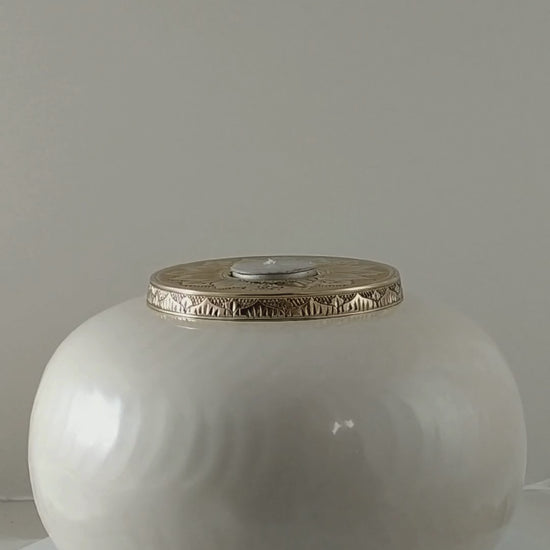 This stunning White and Gold Candle Urn is made from solid brass. The white enamel coating has a natural soft hammer pattern running in circles around the body of the urn. The lid is made from gold nickel, features a beautiful mandala pattern and houses a tealight candle. This cremation urn requires no maintenance, is very well made and is heavy in weight.